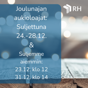 poikkeuksena suljemme jouluaatonaattona 23.12. klo 12. sekä uudenvuodenaattona 31.12. klo 14.