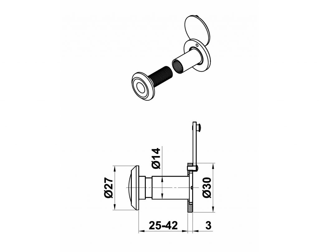 Laadukas ovisilmä 25-45mm paksuihin oviin. Keskiosan halkaisija 14mm.